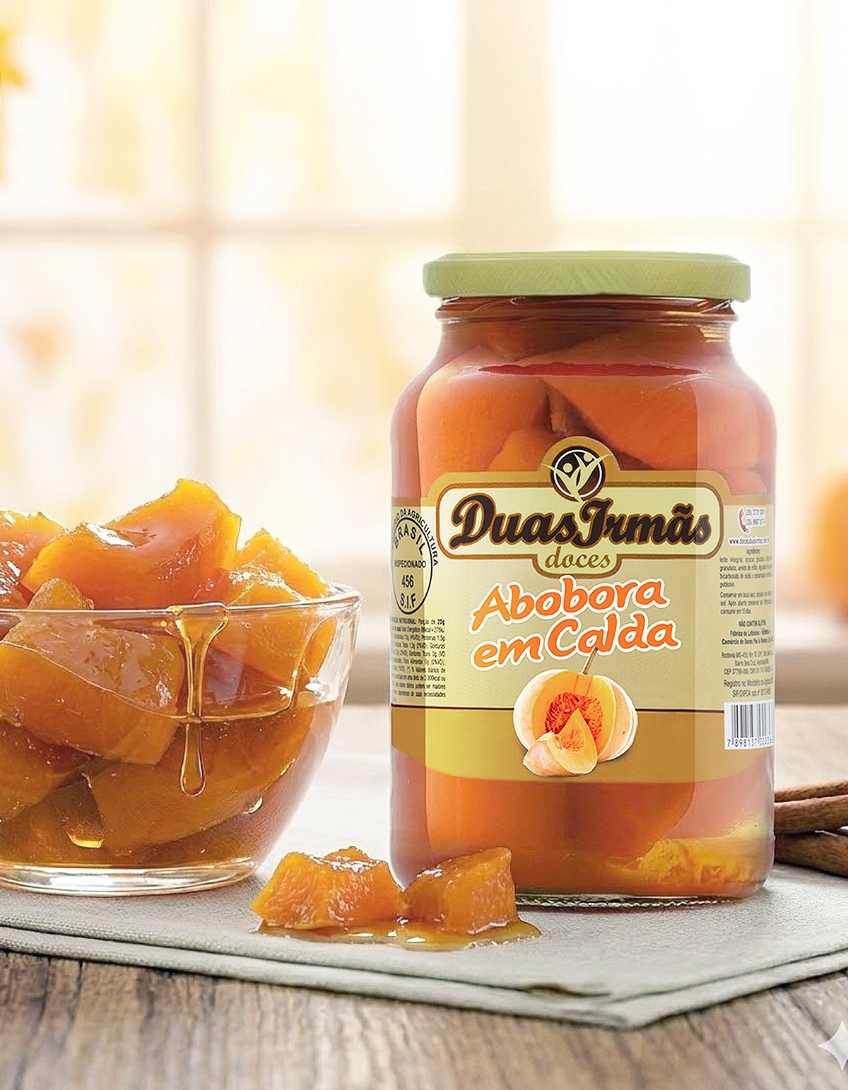 O Doce de Abóbora em Calda Duas Irmãs combina pedaços macios de abóbora com uma calda suave que realça o sabor natural da fruta.