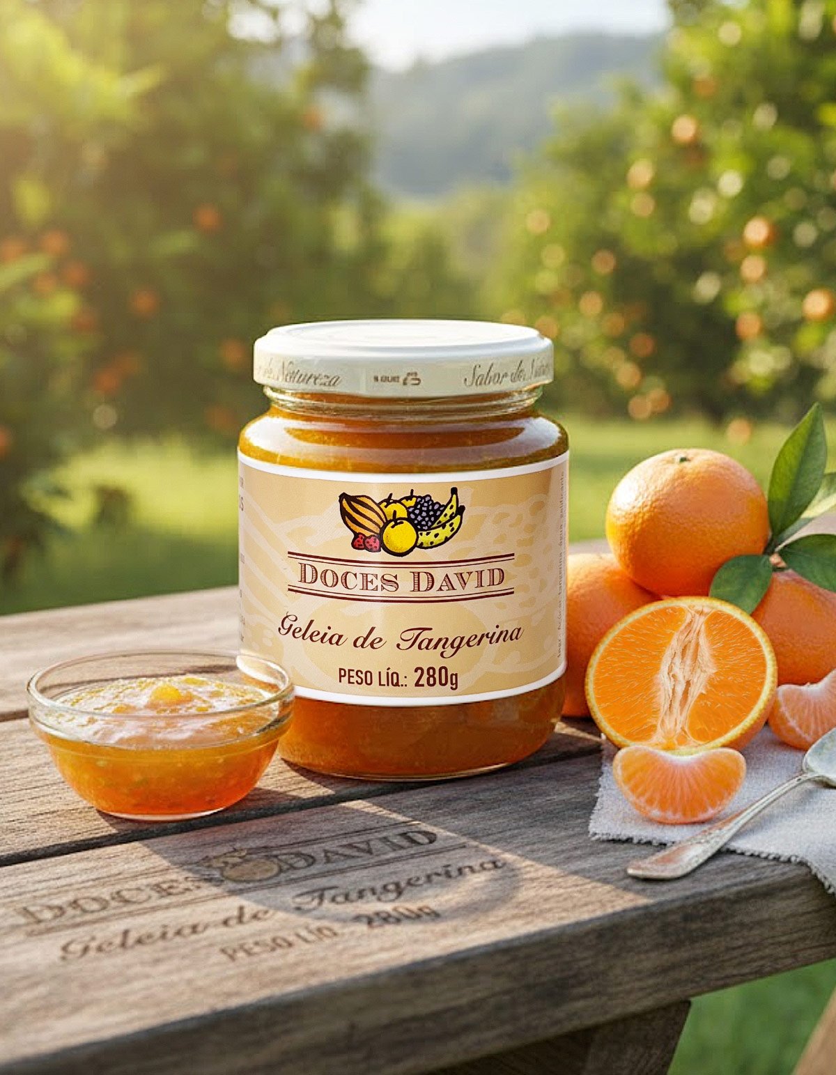 A Geleia de Tangerina Doces David é feita com tangerinas frescas e selecionadas, resultando em um sabor vibrante, levemente cítrico e naturalmente aromático.