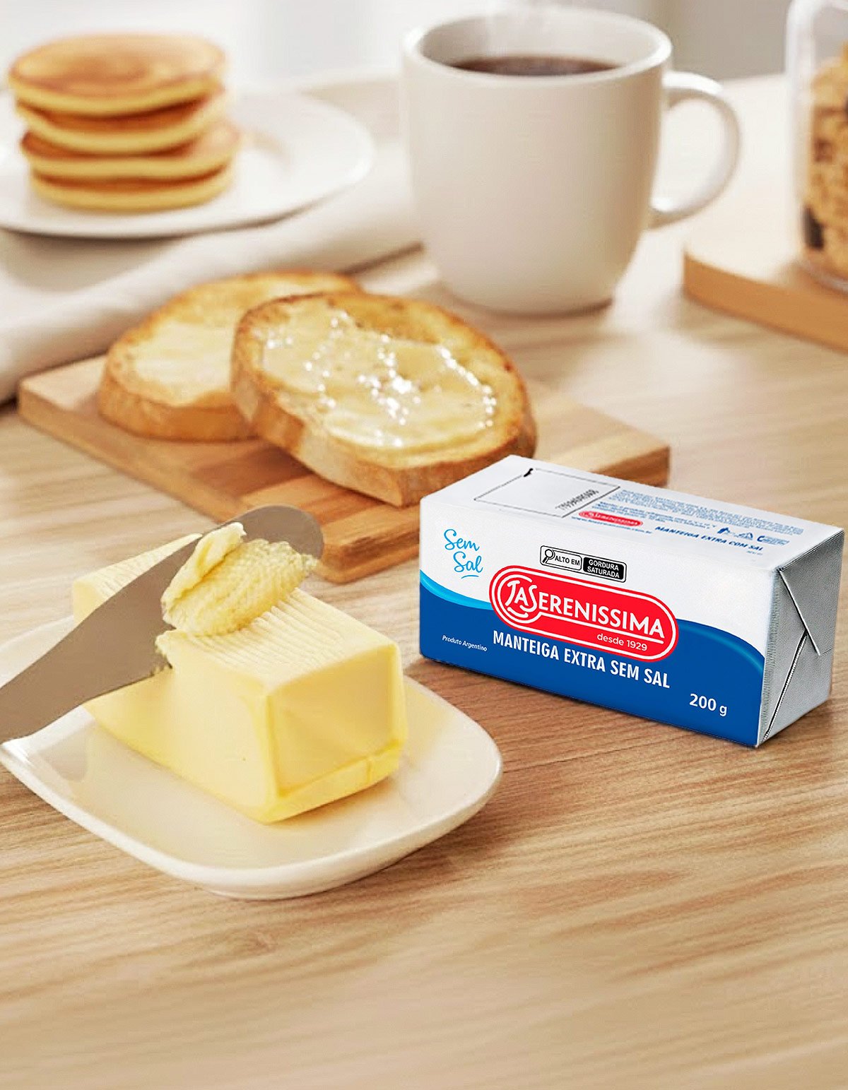 A Manteiga Extra Sem Sal La Sereníssima é uma tradição argentina reconhecida pela pureza, cremosidade e qualidade superior. Feita apenas com creme de leite pasteurizado, tem sabor suave e textura macia, ideal para quem busca mais controle no preparo das receitas.
