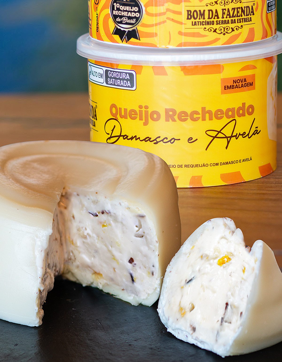 O Queijo Recheado com Requeijão, Damasco e Avelã Bom da Fazenda é uma combinação inusitada que resulta em um sabor verdadeiramente inigualável.